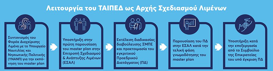 Δυνάμει του άρθρου 159 του ν. 4635/2019, όπως ισχύει, το ΤΑΙΠΕΔ ενεργεί ως Αρχή Σχεδιασμού, κατά την έννοια της περιβαλλοντικής νομοθεσίας {σύμφωνα με την κοινή υπουργική απόφαση ΥΠΕΧΩΔΕ/ΕΥΠΕ/οικ. 107017 (Β΄1225/2006)}, για τον Οργανισμό Λιμένος Πειραιώς, τον Οργανισμό Λιμένος Θεσσαλονίκης, καθώς και για τα 10 περιφερειακά λιμάνια του χαρτοφυλακίου του, συμπεριλαμβανομένων των δραστηριοτήτων που θα υπο-παραχωρηθούν σε επενδυτές δυνάμει του ν. 4597/2019. Ο ρόλος του ΤΑΙΠΕΔ ως Αρχής Σχεδιασμού συνίσταται για τον καθένα από τους λιμένες αυτούς στα εξής: