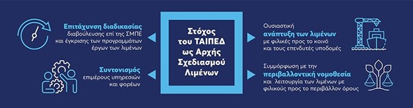 Το ΤΑΙΠΕΔ ως Αρχή Σχεδιασμού Λιμένων, μέσω της εμπειρίας από την περιβαλλοντική ωρίμανση μεγάλων επενδυτικών έργων, της τεχνογνωσίας που διαθέτει και της εξοικείωσης με τις διαδικασίες του Δημοσίου, στοχεύει στην ανάπτυξη των λιμενικών υποδομών της χώρας και στην προώθηση επενδύσεων και έργων με θετικό πρόσημο για τις τοπικές κοινωνίες, καθώς θα βελτιώσουν τις υφιστάμενες δομές και θα δημιουργήσουν νέες θέσεις εργασίας.