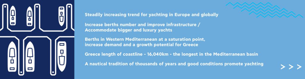 The entrance of the marina is oriented to the north and protected by the remnants of the old port. The marina has zoning and planning arrangements in place, with a marine area of about 70,000 sq. m. and a land area of about 13,000 sq. m. Its capacity amounts to 175 berthing docks. The marina has the following infrastructure: