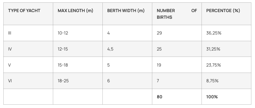 The total surface of the land area of the yacht shelter is 7.800 sq. m. while the sea zone covers 35.000 sq. m. With the completion of the aforementioned development project, the yacht shelter capacity will be in total 80 berths for yachts up to 25m in length, the berth mix of the yachts will be in detail as presented in the below table and diagram: